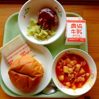 今日の献立は「コッペパン・牛乳・手作りハンバーグ・スライスチーズ・カレーキャベツ・ミネストローネ」です。