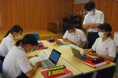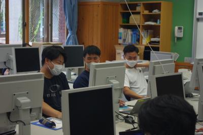 代表生徒3名がサイエンスチャレンジに出品する作品を作っています。途中、大きなミスに気づき、急いで修正しています。学校閉庁日開けの8月18日が作業最終日となります。