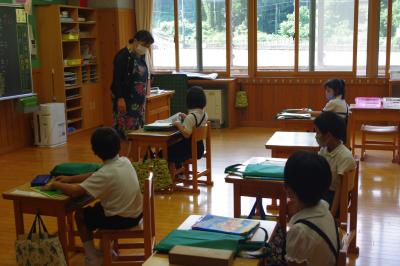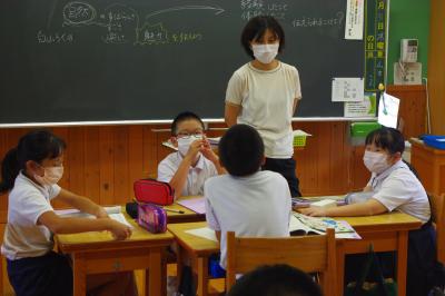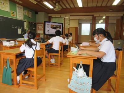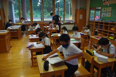 小学校の登校日です。夏休みの宿題を提出したり、読書感想文の下書きを書いたり、GIGA端末で撮影した夏の思い出を編集したりしています。