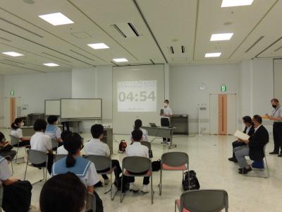 8月21日(日)白山市議会会場にて、市内の中学生17名が、地域発展に向けた政策について市議会の一般質問と同じ形式で意見交換するはくさん市子ども会議に、本校代表生徒2名も参加しています。