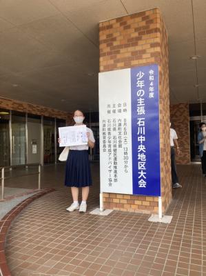 少年の主張石川県中央地区大会が内灘町文化会館で行われ、白山市、野々市市、河北郡市の中学校代表15人が意見を発表しています。本校の生徒も白山市代表の一人として発表し、奨励賞を受賞しています