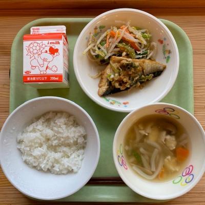 今日の給食は「ごはん 牛乳 さばの味噌煮 ごま酢あえ けんちん汁」です。