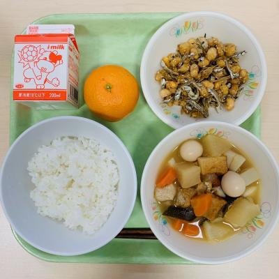 今日の給食は「ごはん 牛乳 大豆と小魚の揚げ煮 おでん みかん」です。