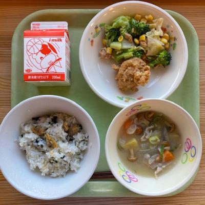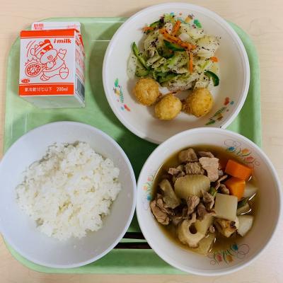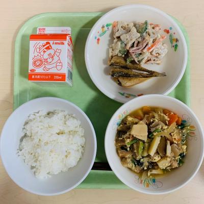 今日の給食は「ごはん 牛乳 はたはたのから揚げ れんこんサラダ 卵とじ」です。