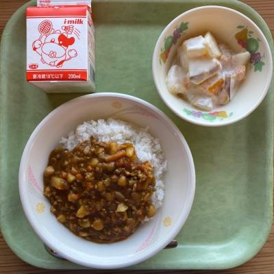 今日の給食は「豆のドライカレー 牛乳 フルーツヨーグルト」です。