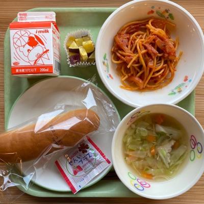 「コッペパン 牛乳 いちごジャム レストラン特製トマトスパゲティ 野菜スープ かんたんスィートポテト」です。