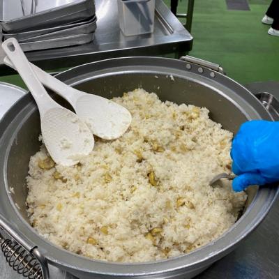 今日の給食は「栗おこわ 牛乳 鮭の塩こうじ焼き ひじきとれんこんの炒り煮 めった汁」です。