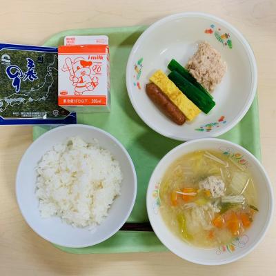 今日の給食は「手巻きずし 牛乳 とりだんご汁」です。