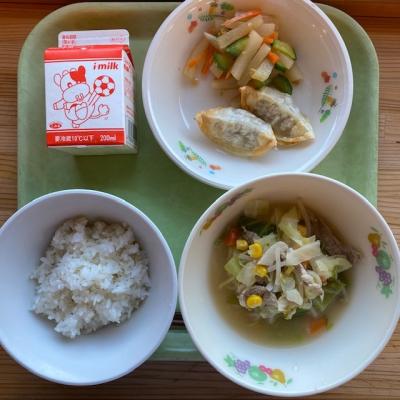 今日の給食は「麦ごはん 牛乳 焼きギョウザ 大根のピリからあえ 味噌ラーメン」です。