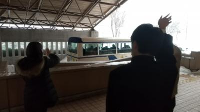 中学校1・2年は火曜と木曜は体育の授業として午後のスキーを、水曜は部活動として午後のスキーを行っています。アルペンとクロスの競技場に向かうバスを、中学校3年生が見送っています。