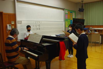 音楽 卒業式の歌の練習をしています。密にならないよう間隔をとって行っています。
