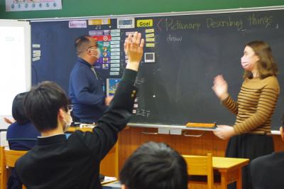 外国語 ハナ先生とアルファベッドのカルタ遊びをしています。先に取れるのはどちらか、競っています。