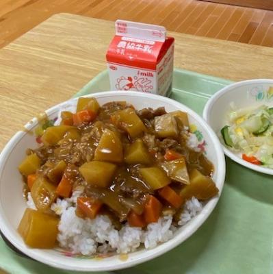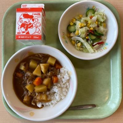 今日の給食は「カレーライス 牛乳 コーンサラダ」です。