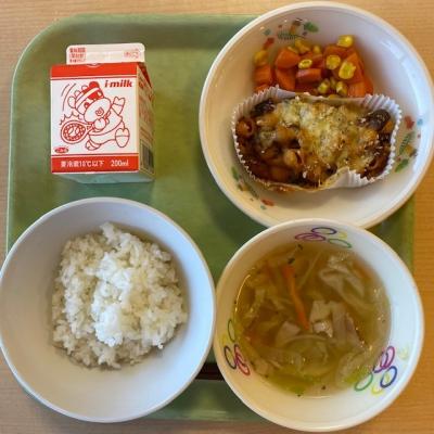 今日の給食は「ごはん 牛乳 野菜のミートグラタン にんじんグラッセ コンソメジュリアン」です。
