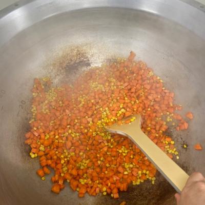 にんじんは茹でずにバターでゆっくりと炒めてつくる給食のグラッセは、最後にあわせるコーンの甘みとほんの少しの調味料だけで、とってもおいしく仕上がります。