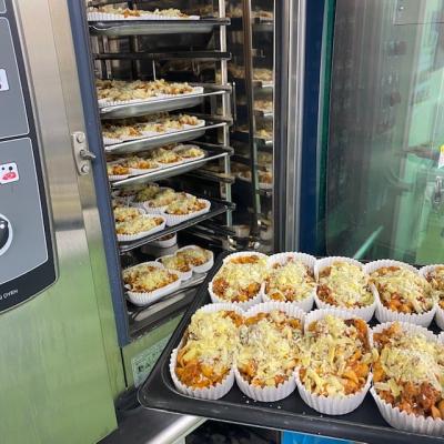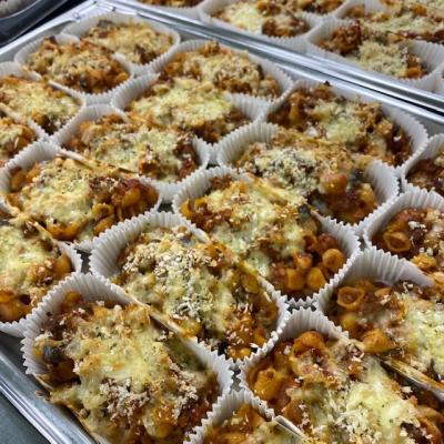 ひき肉や玉ねぎなどの具を炒めて、茹でたマカロニを加えて、カップに詰めて焼き上げます。