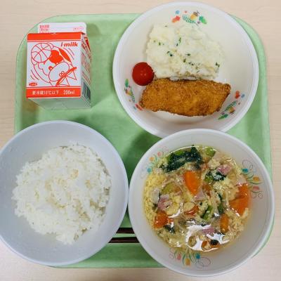 献立は「ごはん 牛乳 ころもうみ くもぐちゃらん まんげつぷちゅっと たまごとえだみかんのスープ」です。