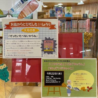 9月からまた始まった図書館と給食のコラボです。図書館の前にも掲示と本が飾ってあります。