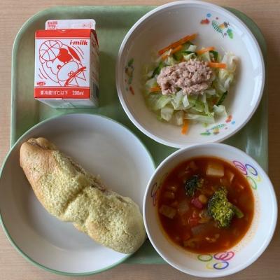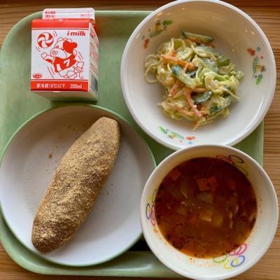 今日の給食は「揚げパン 牛乳 たまごサラダ ミネストローネ」です。