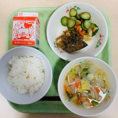 今日の献立は「ごはん 牛乳 さばのしょうが煮 やさいのピリからあえ 豚汁」です。