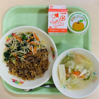今日の給食は「ビビンバ 牛乳 みそワンタンスープ 加賀しずくゼリー」です。