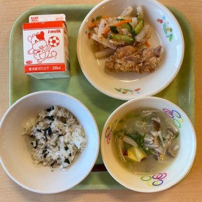 今日の給食は「わかめごはん 牛乳 とりのから揚げ 大根とツナのあえもの めった汁」です。