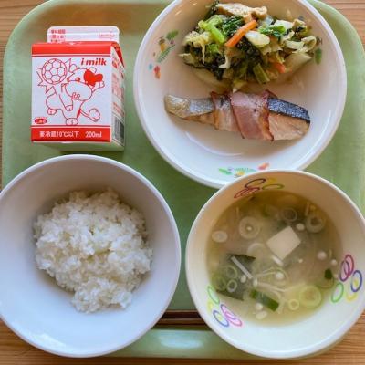 今日の給食は「ごはん 牛乳 さけのベーコン巻き ごまあえ とうふのみそ汁」です。