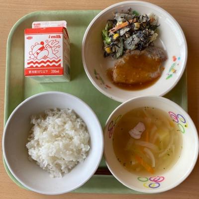 今日の給食は「ごはん 牛乳 豚肉のガーリックソース ひじきのサラダ コンソメスープ」です。