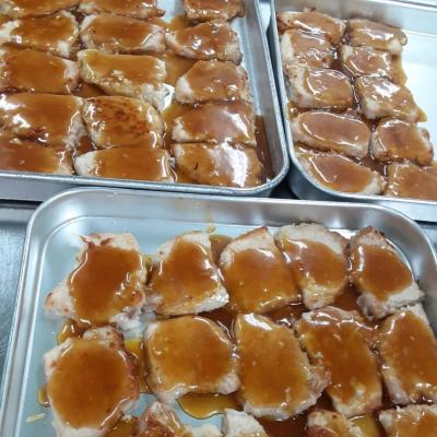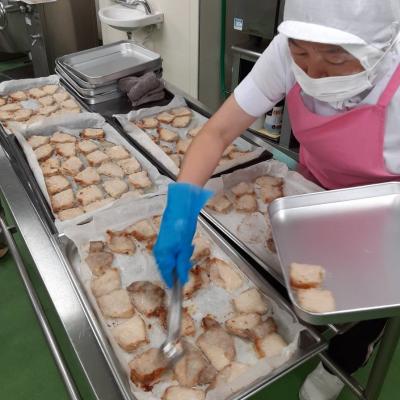 今日は、油で揚げた豚肉を甘辛いたれにからめたくわ焼きです。とってもごはんがすすむ献立のひとつです。