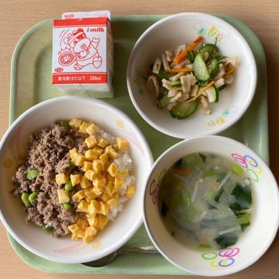 給食の三色どんぶりは、鶏そぼろと鯖そぼろの2パターンがあります。