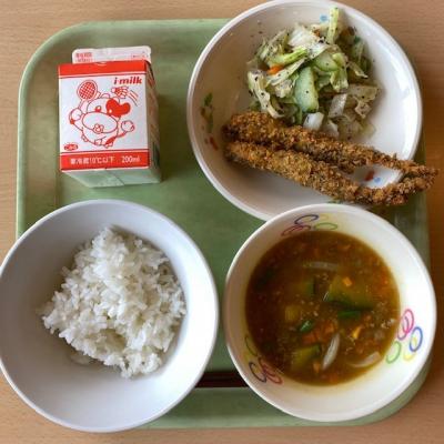 今日の給食は「ごはん 牛乳 ししゃもの青のりフライ ゆかりあえ かぼちゃのカレーそぼろ煮」です。