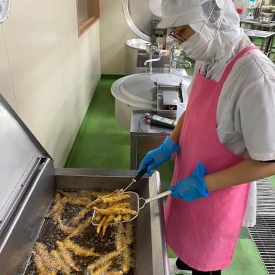 今日のししゃもは一匹ずつていねいにパン粉付けして、給食時間ギリギリに揚げます。