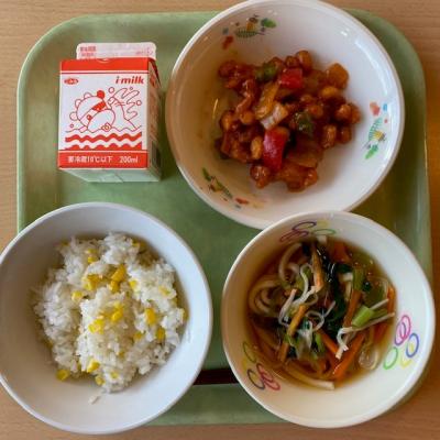今日の給食は「コーンごはん 牛乳 鶏肉と大豆のチリソースからめ 冷やしうどん汁」です。