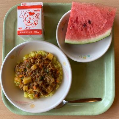 今日の給食は「ターメリックライス 牛乳 キーマカレー すいか」です。