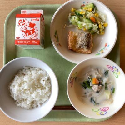 「ごはん 牛乳 鮭ザンギ はちみつレモンソース コーンサラダ 小松菜のミルクみそスープ アイスセレクト」です。