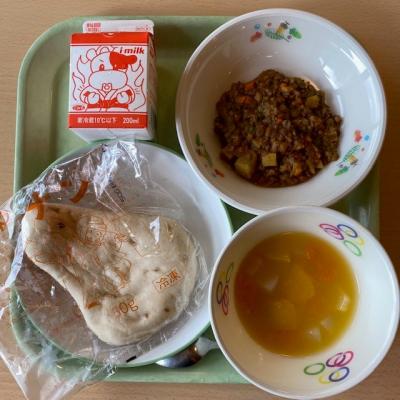 今日の給食は「ナン キーマカレー 牛乳 オレンジポンチ」です。