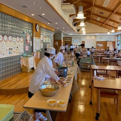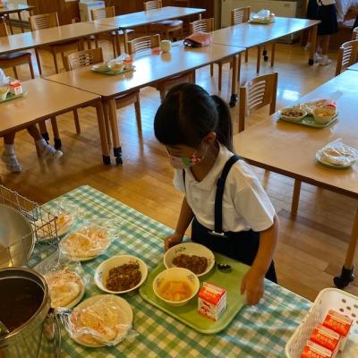 子供たちは久しぶりの給食だけど、上手に配膳できていました。