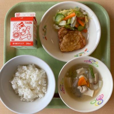 今日の給食は「ごはん 牛乳 豚肉のくわ焼き 即席漬け さつま汁」です。
