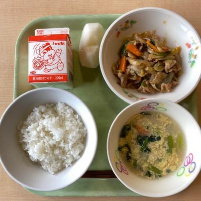今日の給食は「ごはん 牛乳 スタミナ炒め トマトとたまごのスープ」です。