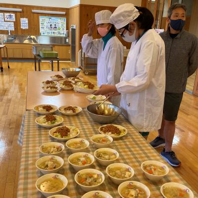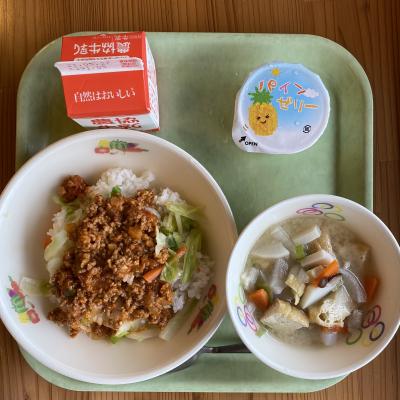 給食では沖縄のB級グルメ「タコライス」をアレンジしたものと「イナムドゥチ(沖縄風豚汁)」が登場しました。
