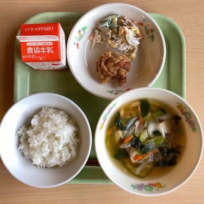 今日は 「ごはん 牛乳 鶏の唐揚げ ごぼうのマヨネーズあえ かやくうどん」