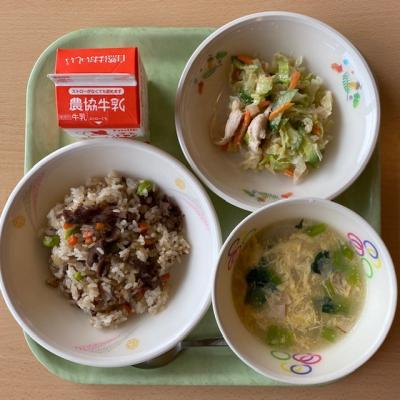 今日の給食は「牛肉ピラフ 牛乳 バンバンジーサラダ コーンかき玉スープ」です。