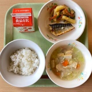 今日の給食は「ごはん 牛乳 さばの塩焼き じゃがいものきんぴら キャベツのみそ汁」です。