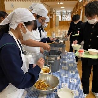 中学生は、給食当番が教室の前で配膳します。