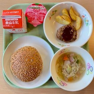 今日の給食はオリンピック献立で「セルフハンバーガー 牛乳 フライドポテト コンソメスープ いちごアイス」です。