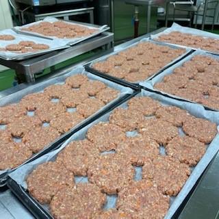 給食では、アメリカならではの「ハンバーガーとフライドポテト」が登場しました。ハンバーグは、ひき肉からこねてひとつずつ丸めてつくります。ハンバーグは縮むので、大きく広げて焼くのがポイントです。