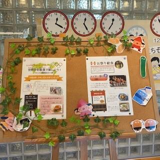 オリンピックのことやハンバーガーの誕生秘話を掲示板に貼ってお知らせしています。