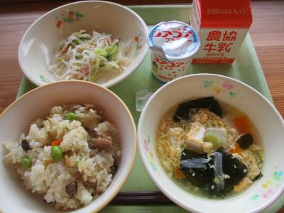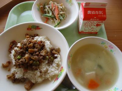今日の献立は「竹の子そぼろ丼、ごま酢、じゃがいものみそ汁、牛乳」です。