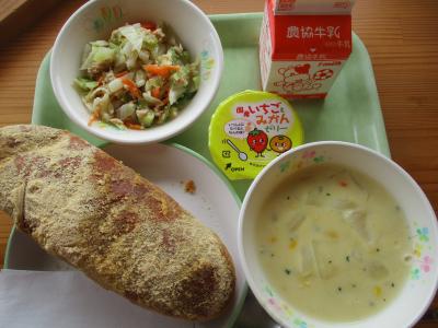 今日の献立は「きなこ揚げパン、コーンシチュー、ツナサラダ、いちごとみかんのゼリー、牛乳」です。