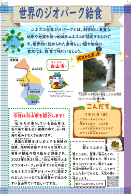 2年前の5月に白山手取川ユネスコジオパークが認定されました。そのことを記念して今月のジオパーク給食は「白山市」で、堅とうふ、木滑なめこ、剣崎なんば等地場産物を使った献立です。